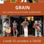 Dans le cadre du festival Jazz sur son 31, Cœur de Garonne accueille un concert du groupe GRA!N, le lundi 13 octobre, à 15h30 à la [...]